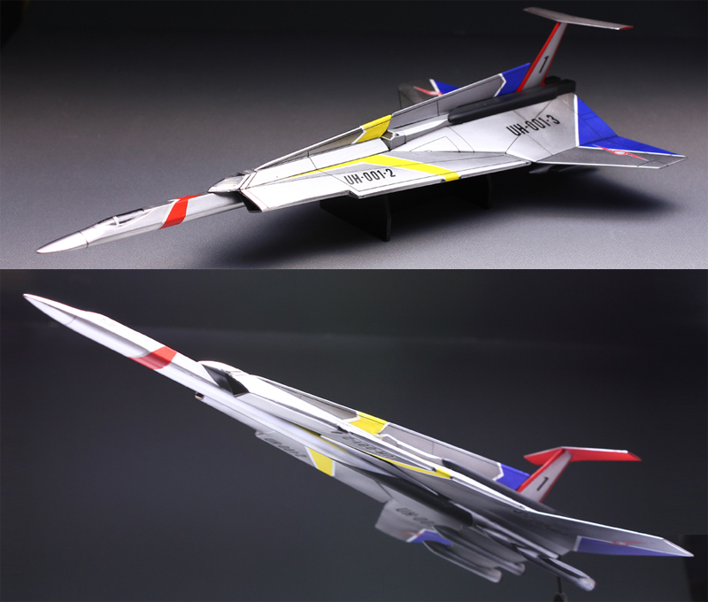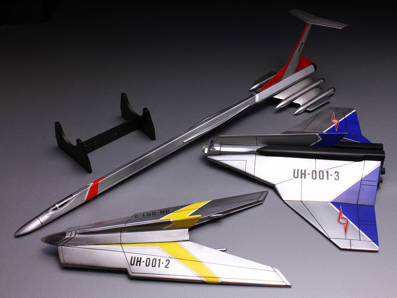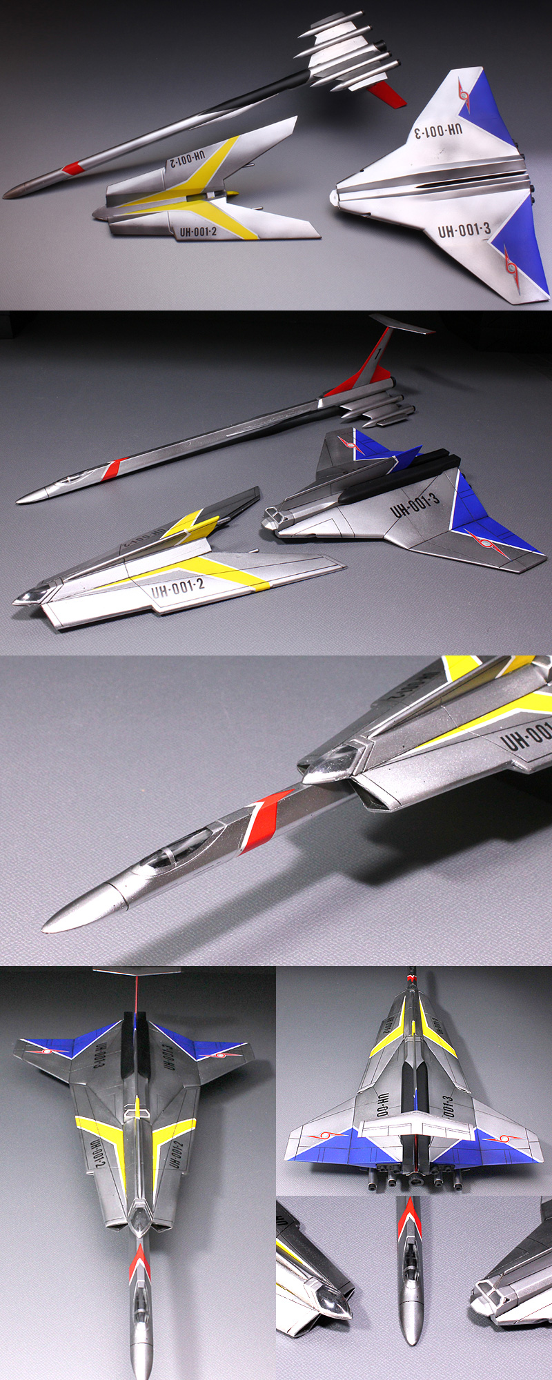 ★パネルライン(スジ彫り)を追加しています。★各機体の内部に強力な磁石を設置し、アルファ号(細長い機体)と他2機の位置が決まるようにしました。★機体全体は黒のサーフェイサーで下地塗装後、Exシルバー(ガイヤカラー)で塗装★全体的にウォッシング処理を施し、スミの拭き取りを粗くしてリアルな感じに仕上げました。★マークと文字デカール以外は(赤・青・黄)塗装です。★トップコートはクリヤーを砂吹きして半光沢仕上げです。