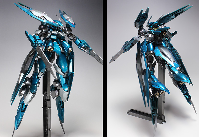 ★説明書に準じて組立てました。★青竹色ベースに蛍光ブルーグリーンを重ね塗り〜キャンディ塗装です。 ★白パーツはガンクローム(メタリック)ベース+クリアーブラックでコート。 ★フレームはメタリックグレー(調色)およびガンメタルで塗装。★バーニアはチタンシルバー(調色) ★全体をウレタンクリアーでオーバーコート。その後、各所にスミ入れ兼フラットブラック塗装。 ★ポイントで一部レッドを塗装しています。★超合金シリーズ(TOY)のような感じに仕上がっています。。