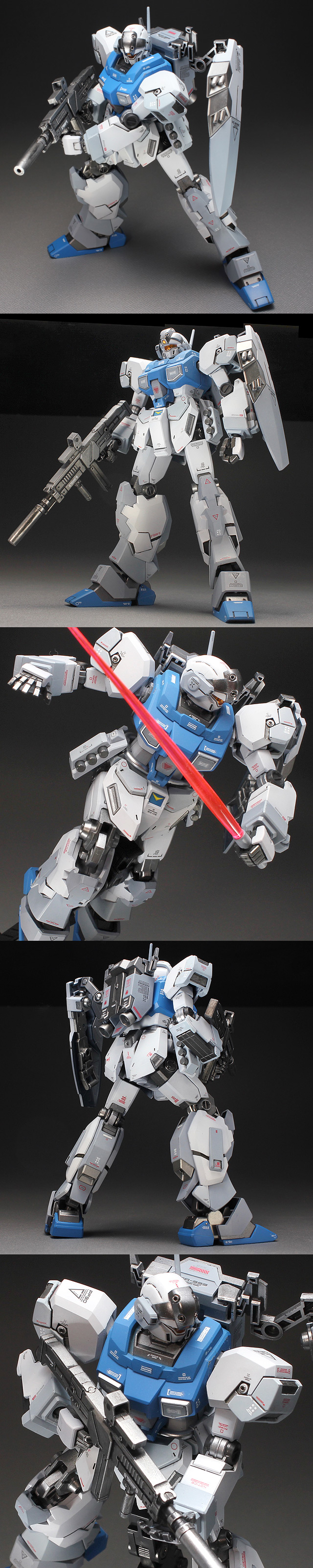 ★連邦のヒロイックなイメージカラー(ブルーとグレー)で仕上げてみました。 ★グレーは明暗の2階調で塗り分けました。★細かいCAUTIONデカールなどを沢山貼りました。 ★チラ見えフレームはガンメタや黒鉄色やメッキシルバーで塗り分け。 ★腰部分の動力パイプはメッキシルバーNEXTで塗装しました。 ★エナメル塗料でスミ入れ。★セミグロスクリヤーでオーバーコートしました。