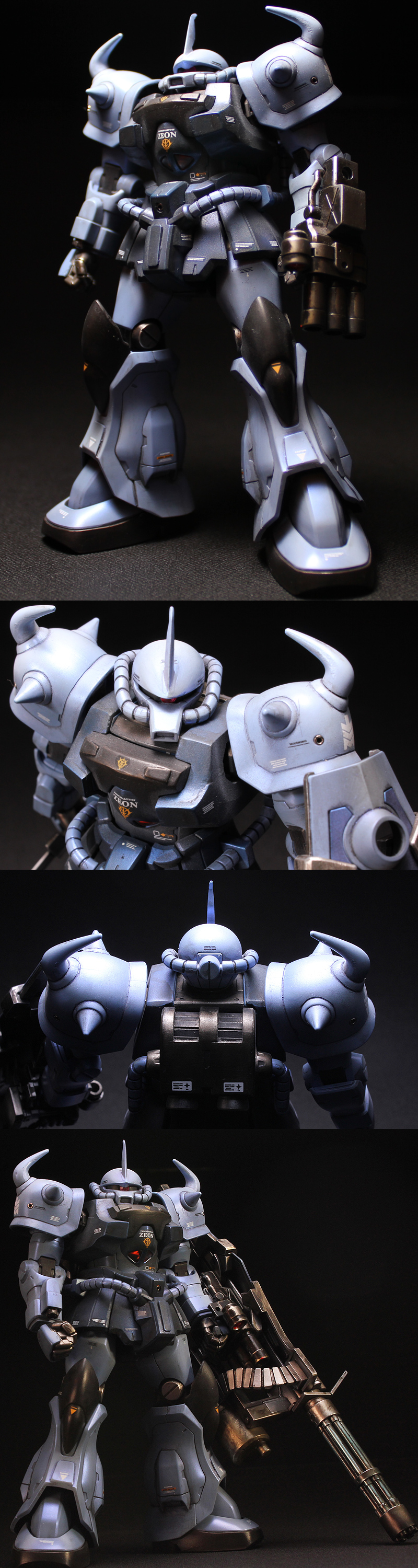 CG風ウェザリング塗装です。パールカラー・クリヤーカラーなどを重ね塗りして、 エナメル塗料でウェザリング塗装を施しました。 トップコートをつや消しでコーティングして独特な質感を表現しています。 ★モノアイをクリヤーシールに変更。★頭部を削り目付きを鋭く。 ★上半身とハカマのボリュームアップ。★シールドアタッチメントにヘアラインを追加。 ★所々にプラ板を貼ってディテールアップ。★アンテナの削り込み。 |