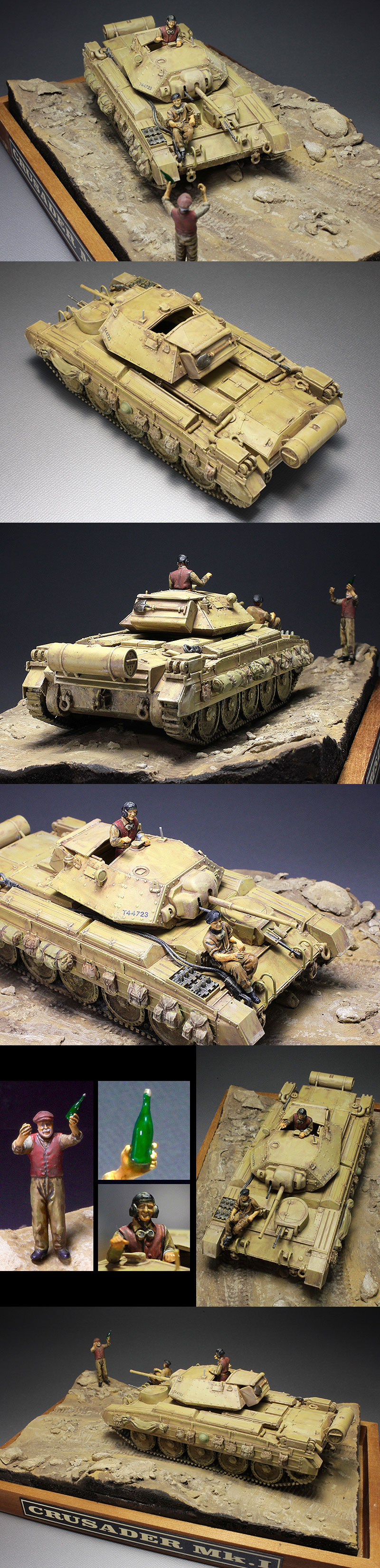 ★クルセーダーMk.I仕様で作成しました。 ★基本塗装を施して、エナメルブラウン等でウォッシング〜ドライブラシでハイライトを入れました。 ★車輪にMr.ウェザリングペーストを盛り~荷物を塗り分け。 ★ビネットと更にフィギュアを追加。